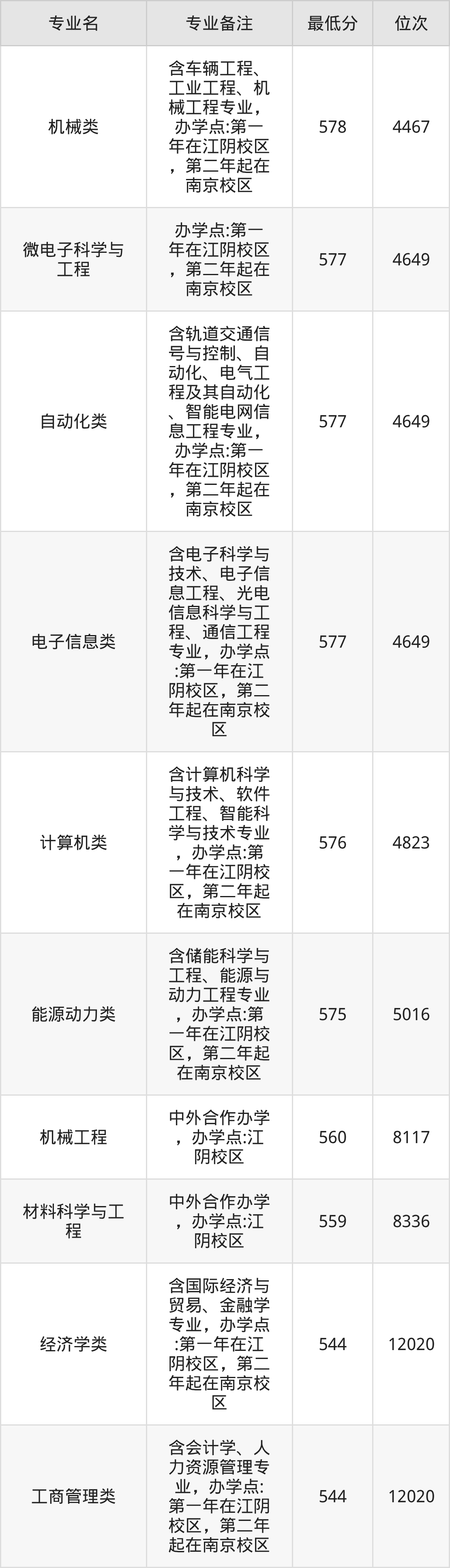 1、机械类(含车辆工程、工业工程、机械工程专业,办学点:第一年在江阴校区,第二年起在南京校区):578分、位次4467名;