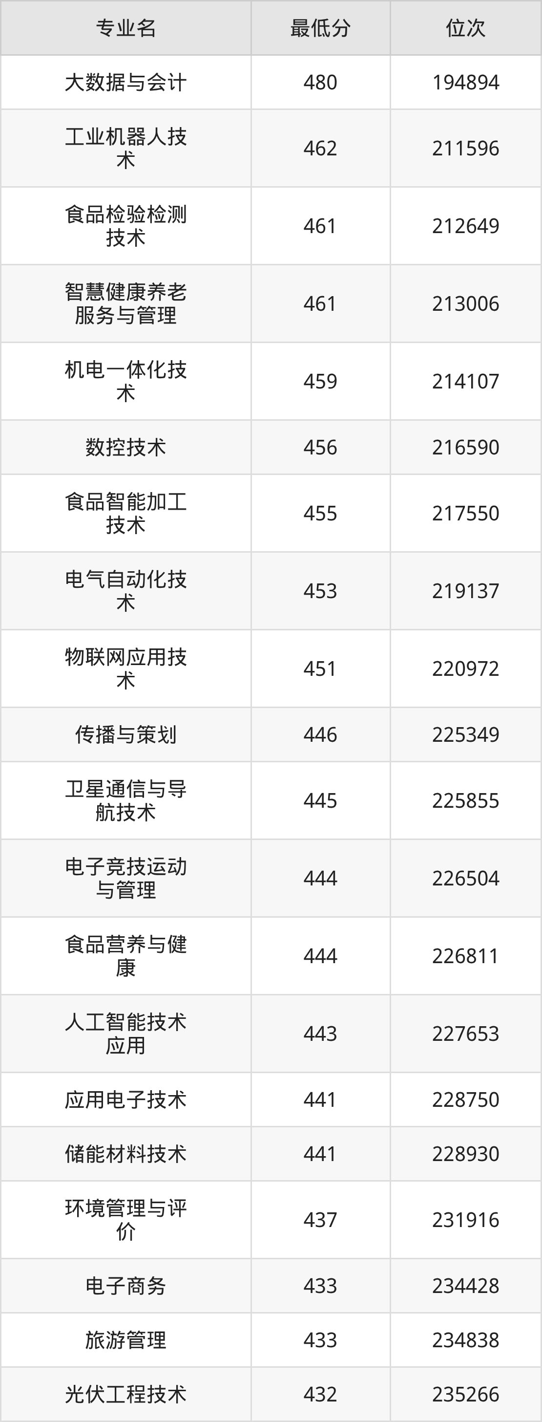 可以发现的是天津现代职业技术学院最低分专业和最高分专业分数差值为53分、位次差值为43903名,不管是分数还是位次,都存在一定差距,因此各位考生在报考时务必参考专业分数线,以免浪费志愿。