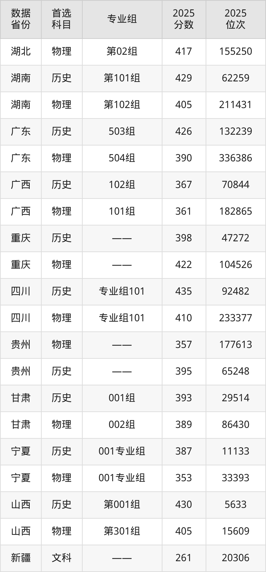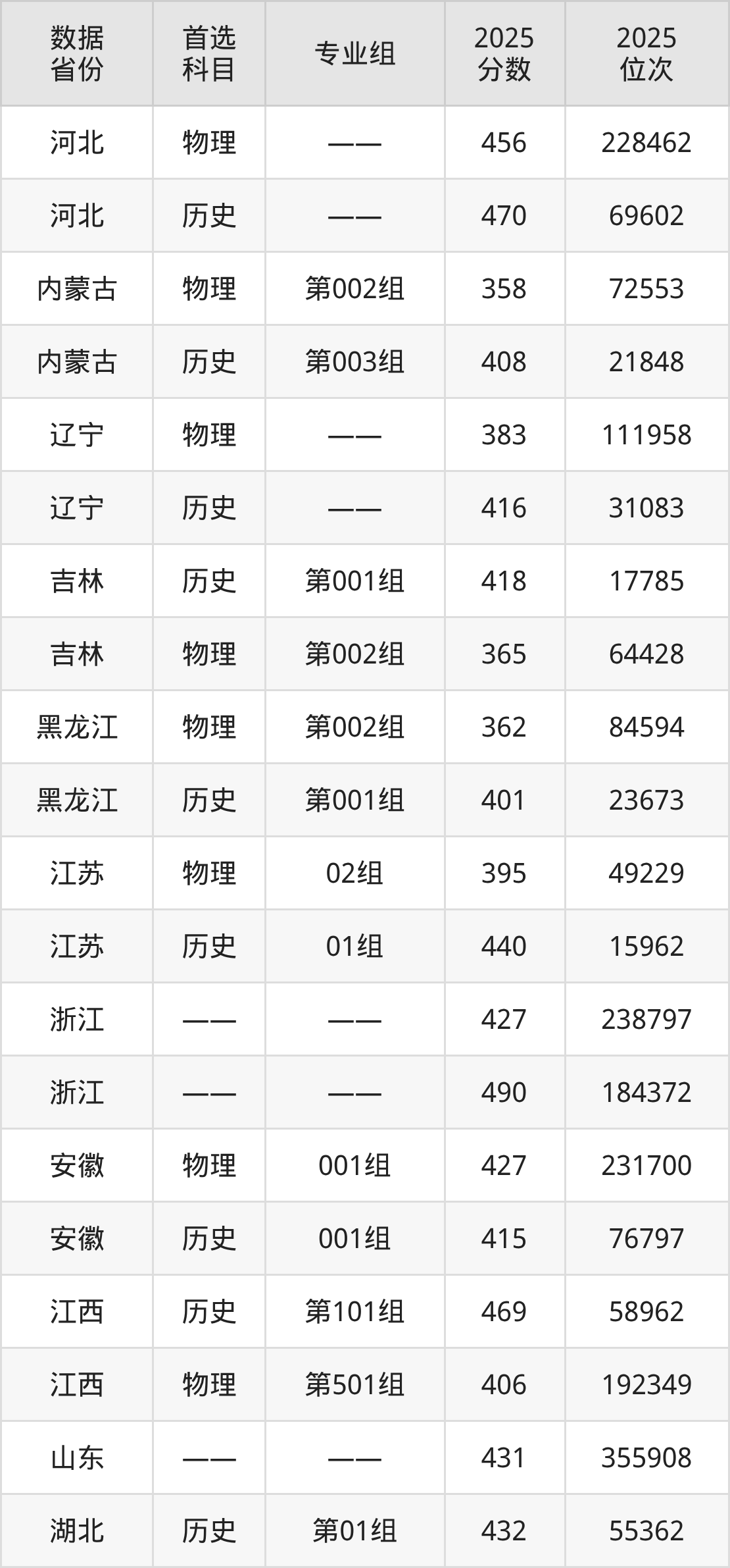 2025年天津现代职业技术学院全国录取分数线最低是246分,最高是490分,平均分在401分左右。在多数地区录取最低分均超过350分。低于350分能上的地区只有新疆,高于平均值较多的是河北、江西、江苏和四川等地,均有专业组最低分在435分及以上。