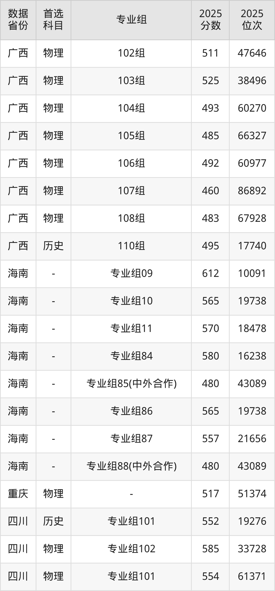 2025年海南医科大学全国录取分数线最低是367分,最高是612分,平均分在512分左右。在多数地区录取最低分均超过420分。低于420分能上的地区只有宁夏、新疆和辽宁,高于平均值较多的是四川、江西、北京和湖南等地,均有专业组最低分在523分及以上。