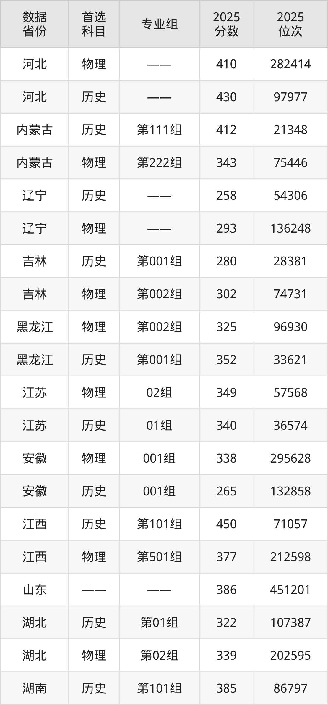 2025年甘肃交通职业技术学院全国录取分数线最低是175分,最高是450分,平均分在350分左右。在多数地区录取最低分均超过260分。低于260分能上的地区只有辽宁和新疆,高于平均值较多的是江西、河北、四川和内蒙古等地,均有专业组最低分在412分及以上。