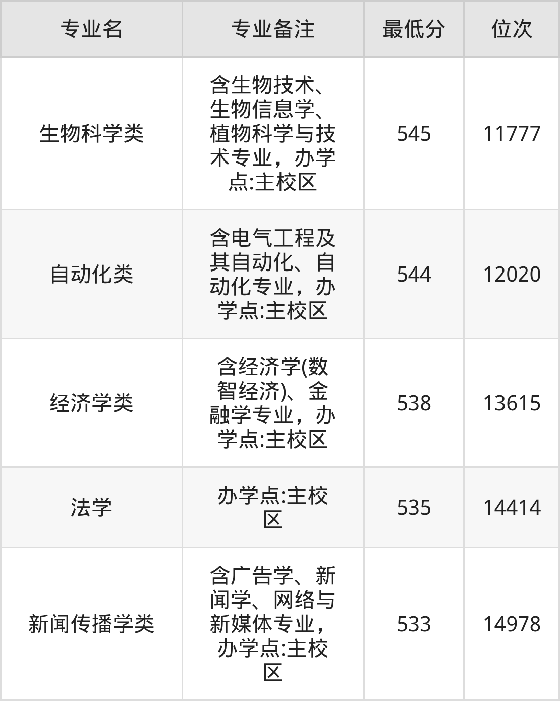1、生物科学类(含生物技术、生物信息学、植物科学与技术专业,办学点:主校区):545分、位次11777名;