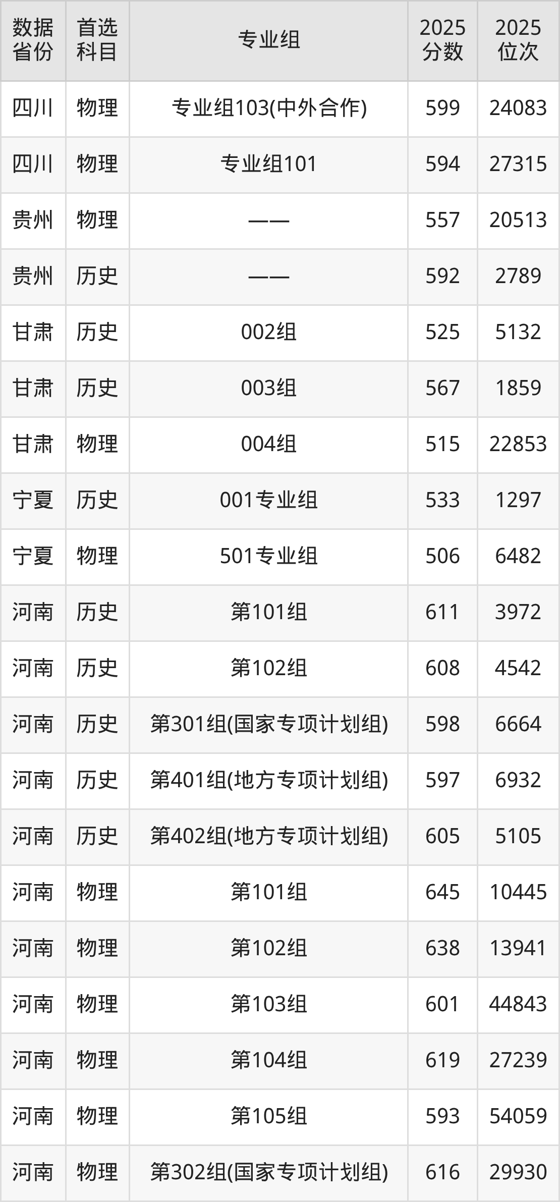 下面是郑州大学各省最低分汇总,各专业组录取分数线可参考下方图片: