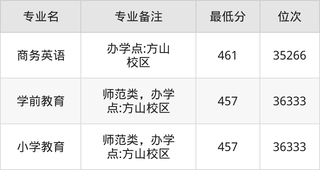 3、小学教育(师范类,办学点:方山校区):457分、位次36333名。