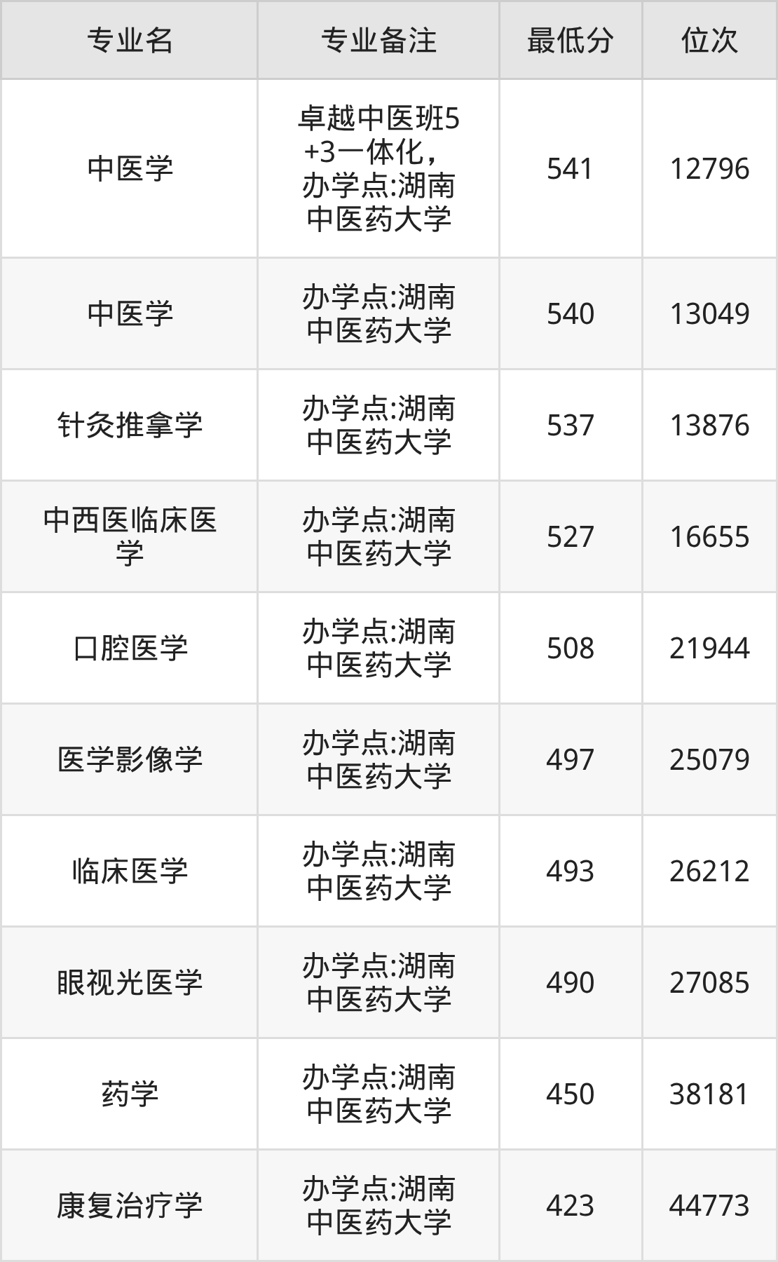 1、中医学(卓越中医班5+3一体化,办学点:湖南中医药大学):541分、位次12796名;