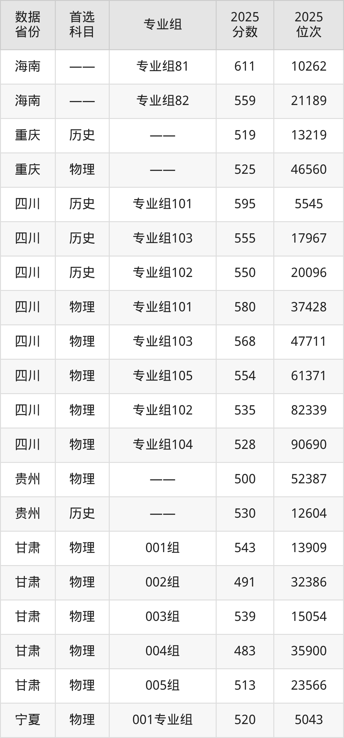 2025年湖南中医药大学全国录取分数线最低是409分,最高是643分,平均分在537分左右。在多数地区录取最低分均超过420分。低于420分能上的地区只有宁夏,高于平均值较多的是湖北、北京、海南和河南等地,均有专业组最低分在559分及以上。
