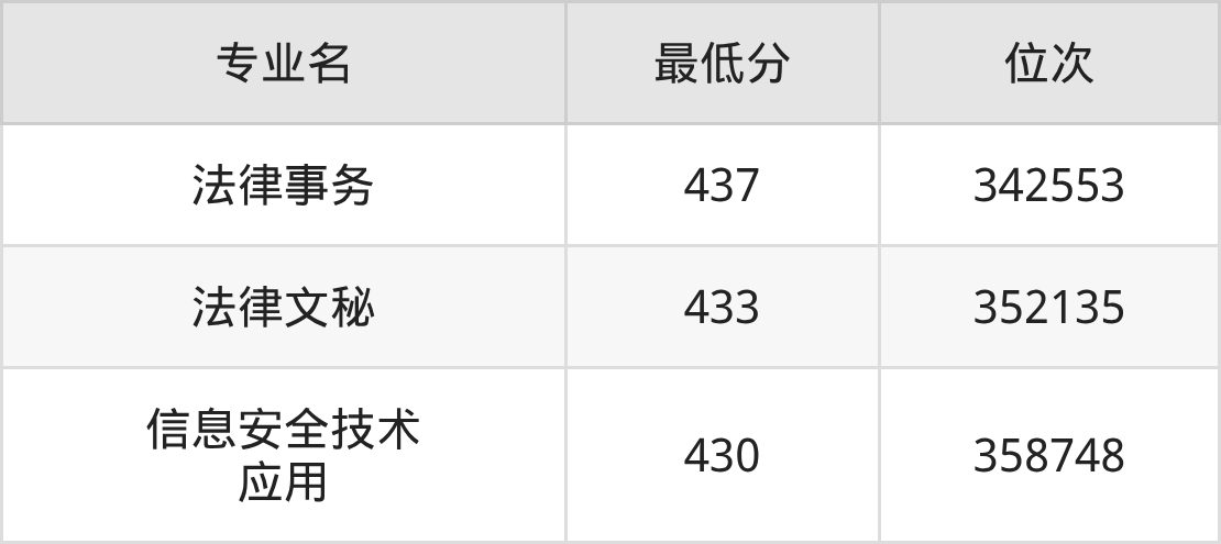 2025年青海警官职业学院招生专业共计3个,其中录取分数线最低的专业是信息安全技术应用,2025年最低分是430分,位次排名是358748名。而该校最难考的专业是法律事务,2025年最低分437分,位次342553名。