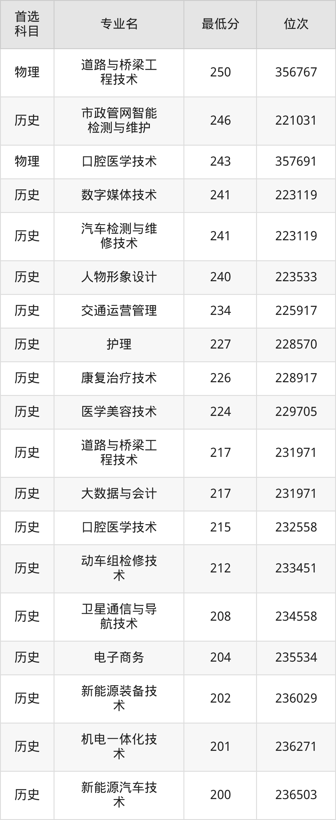二、吉林城市职业技术学院各专业最低分