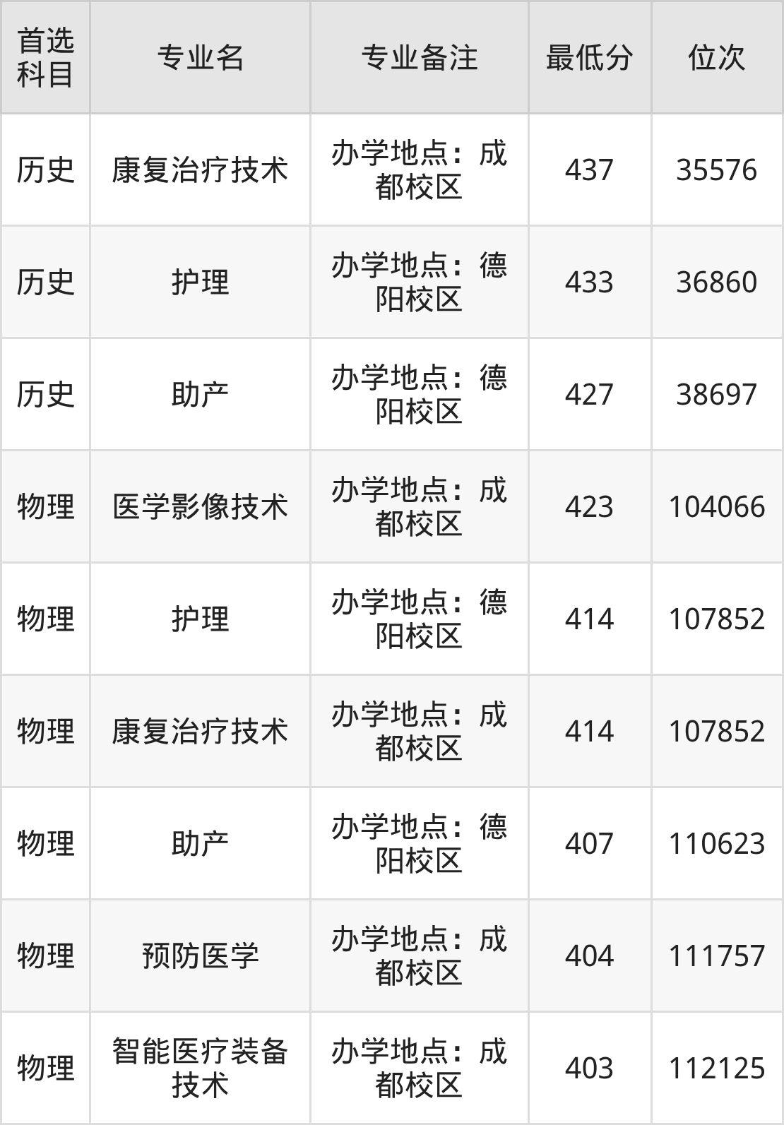1、康复治疗技术(办学地点:成都校区):437分(历史类)、位次35576名;