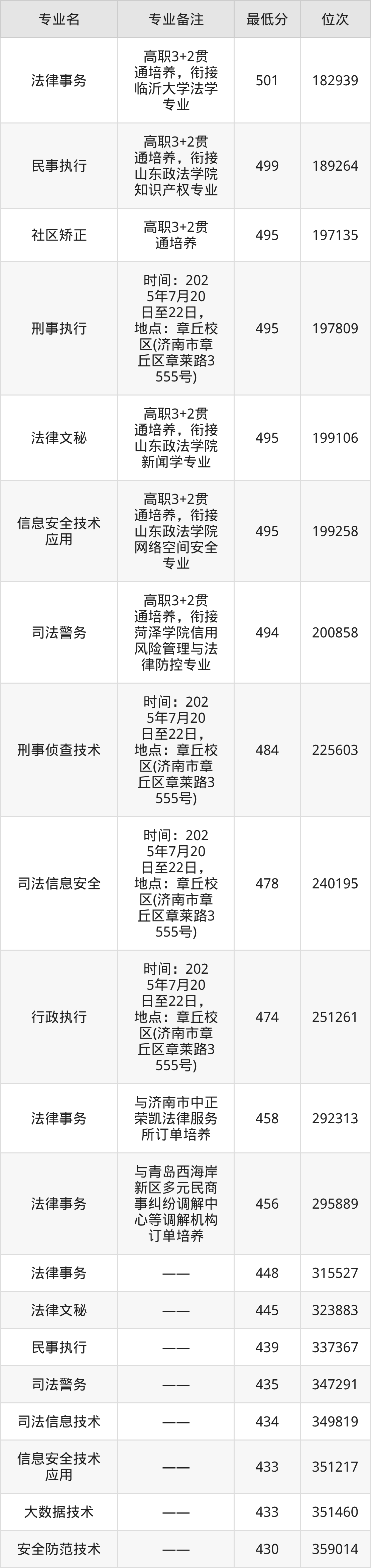 1、法律事务(高职3+2贯通培养)(衔接临沂大学法学专业):501分、位次182939名;