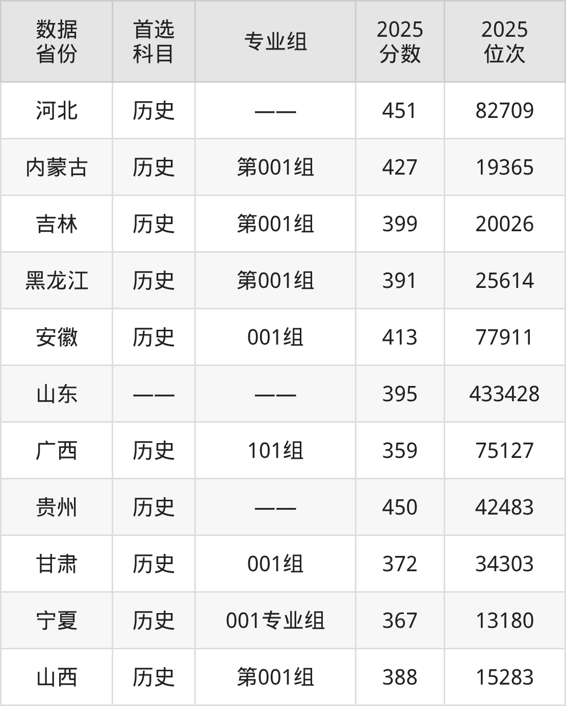 2025年山东司法警官职业学院全国录取分数线最低是359分,最高是451分,平均分在401分左右。在多数地区录取最低分均超过370分。低于370分能上的地区只有宁夏和广西,高于平均值较多的是河北、贵州、内蒙古和安徽等地,均有专业组最低分在413分及以上。