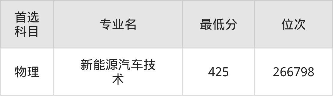 1、新能源汽车技术:425分(物理类)、位次266798名。