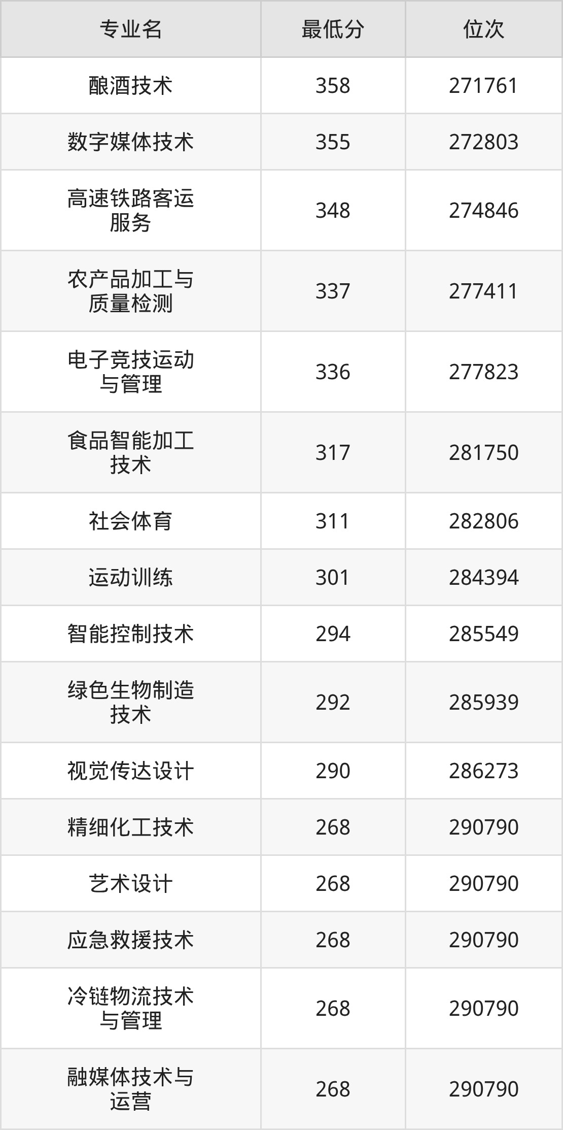 2025年潍坊食品科技职业学院全国录取分数线是158分到310分之间,其中在山东省录取最低分:158分。参考浙江招录数据,各专业分数线是:酿酒技术358分、数字媒体技术355分、高速铁路客运服务348分等。