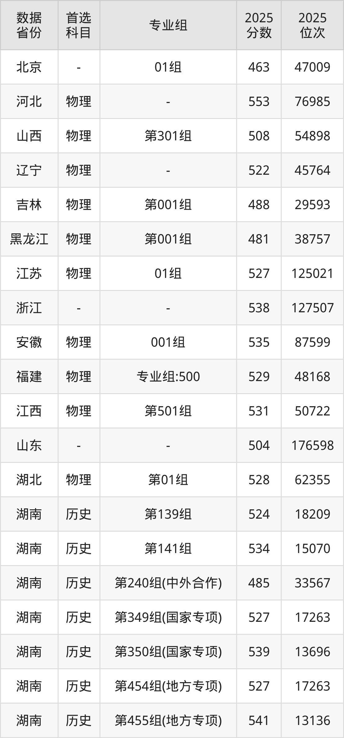 2025年湖南第一师范学院全国录取分数线最低是457分,最高是555分,平均分在511分左右。在多数地区录取最低分均超过470分。低于470分能上的地区只有北京和湖南,高于平均值较多的是海南、河北、浙江和安徽等地,均有专业组最低分在535分及以上。