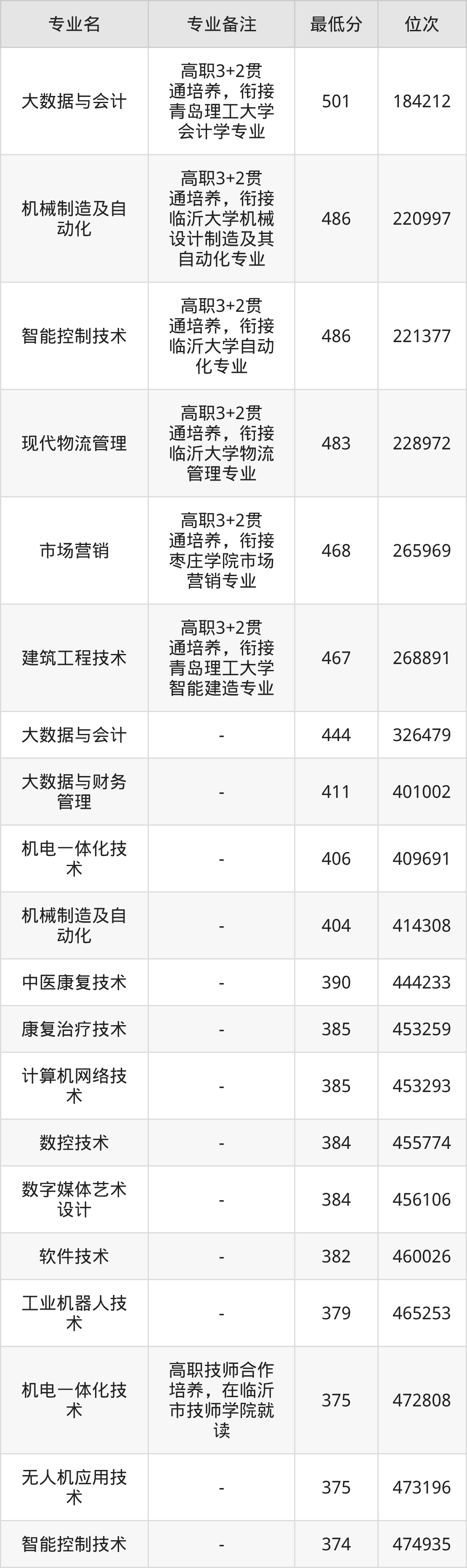 下面是临沂职业学院各省最低分汇总,各专业组录取分数线可参考下方图片: