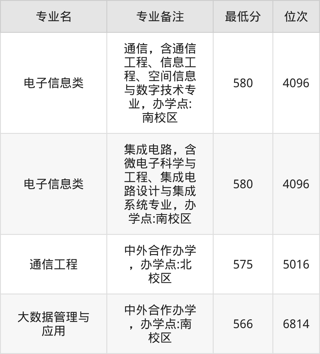 1、电子信息类(通信,含通信工程、信息工程、空间信息与数字技术专业,办学点:南校区):580分、位次4096名;