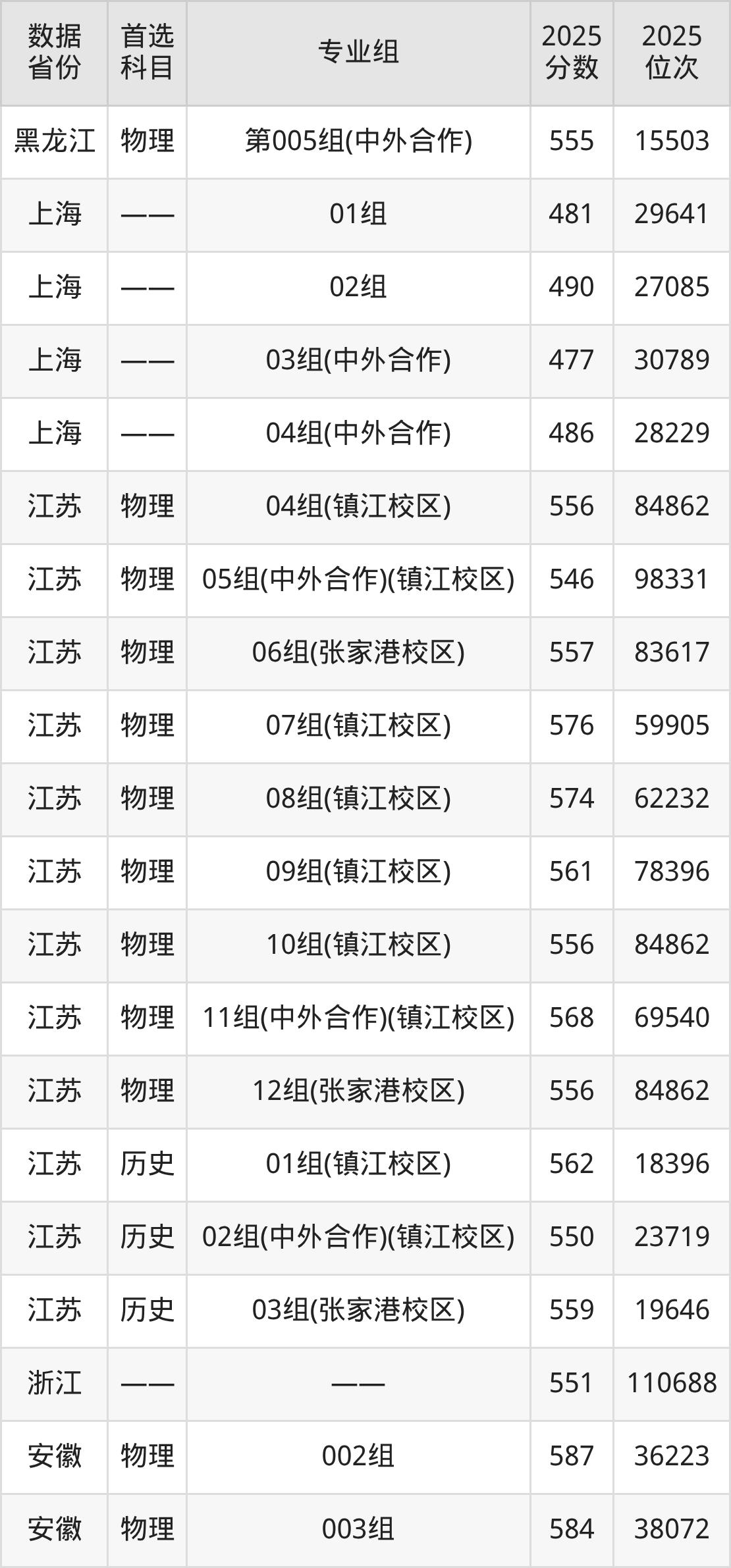 2025年江苏科技大学全国录取分数线是454分到597分之间,其中在江苏省录取最低分:物理组546分、历史组550分。参考上海招录数据,各专业分数线是:计算机科学与技术(办学点:江苏镇江)499分、水声工程(办学点:江苏镇江)498分、船舶与海洋工程(办学点:江苏镇江)496分等。