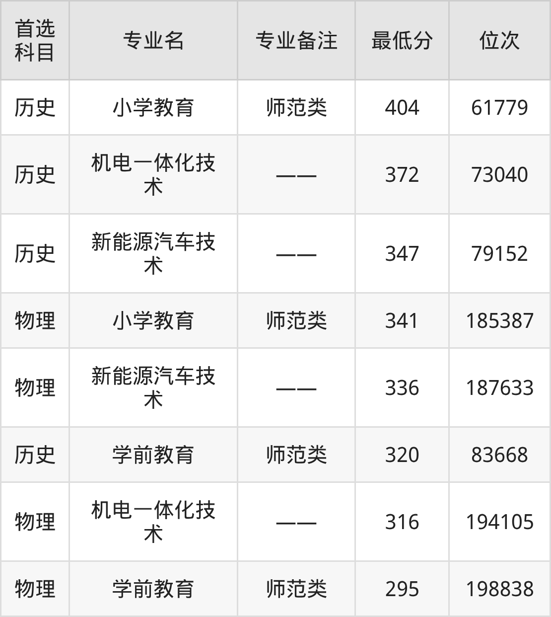 1、小学教育(师范类):404分(历史类)、位次61779名;