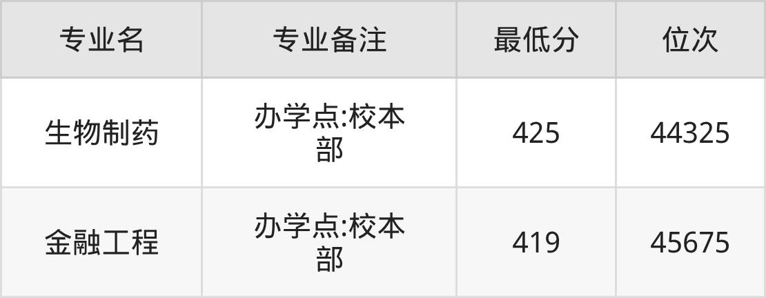 1、生物制药(办学点:校本部):425分、位次44325名;