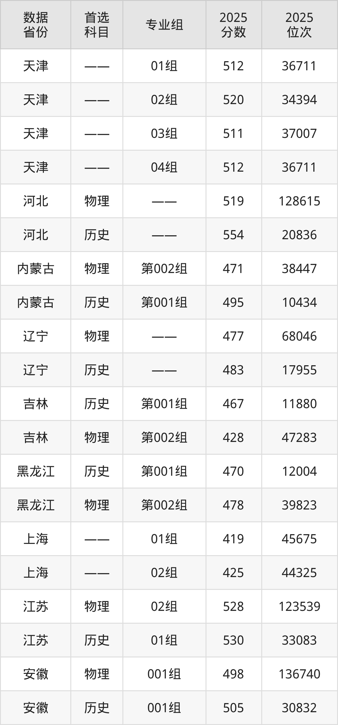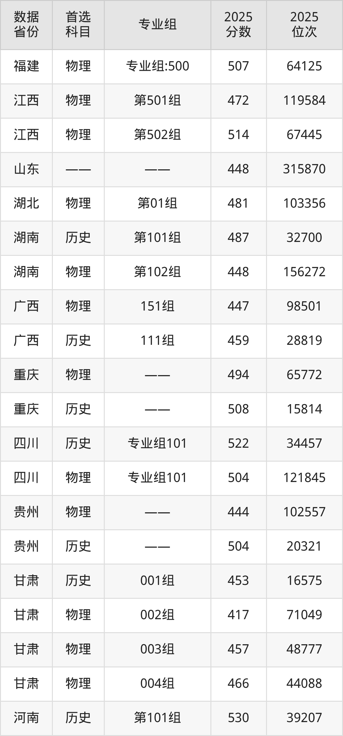 2025年济宁学院全国录取分数线最低是417分,最高是554分,平均分在487分左右。在多数地区录取最低分均超过430分。低于430分能上的地区只有吉林、上海和甘肃,高于平均值较多的是河北、江苏、河南和四川等地,均有专业组最低分在522分及以上。
