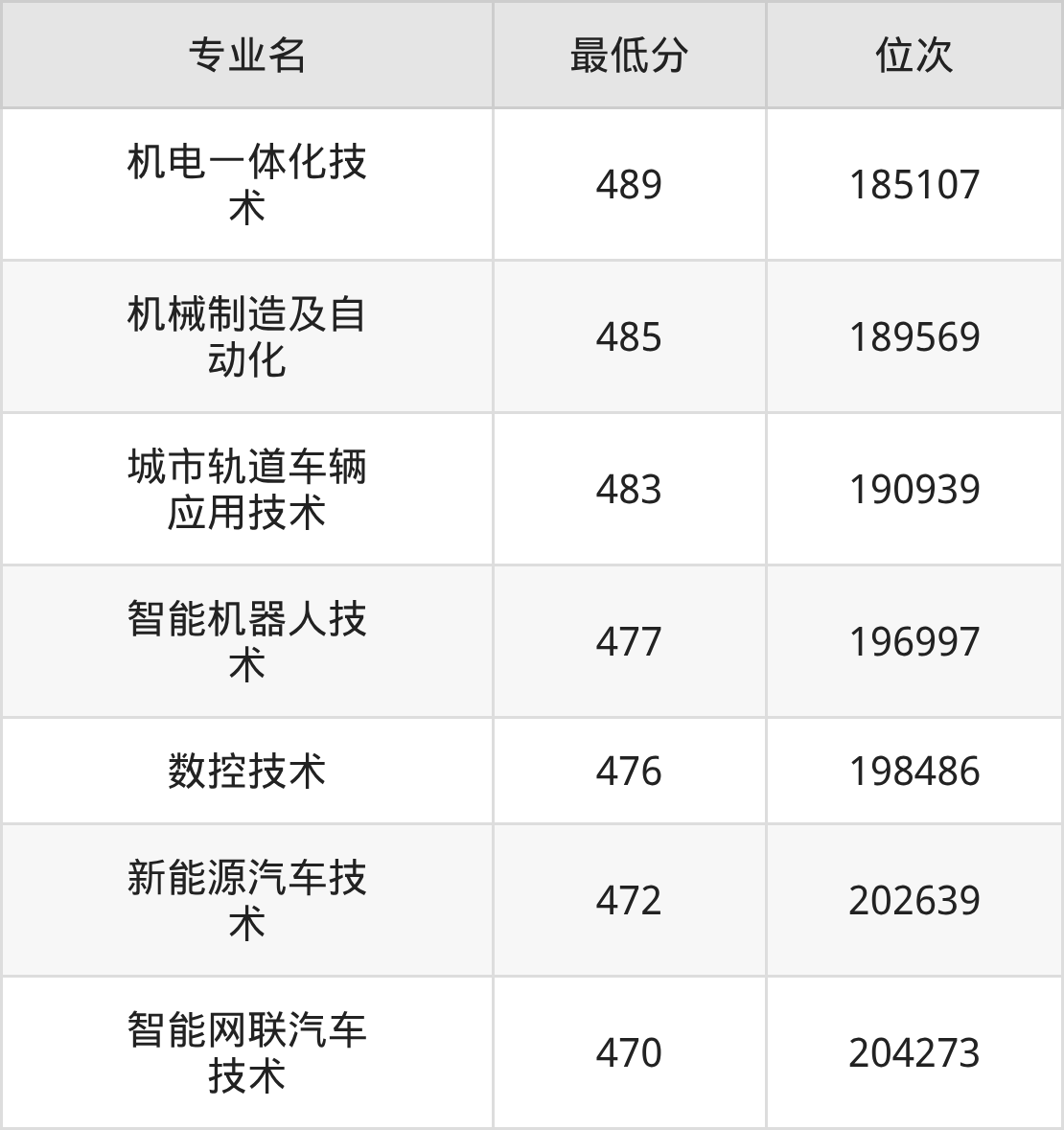2025年常州机电职业技术学院招生专业共计7个,其中录取分数线最低的专业是智能网联汽车技术,2025年最低分是470分,位次排名是204273名。而该校最难考的专业是机电一体化技术,2025年最低分489分,位次185107名。