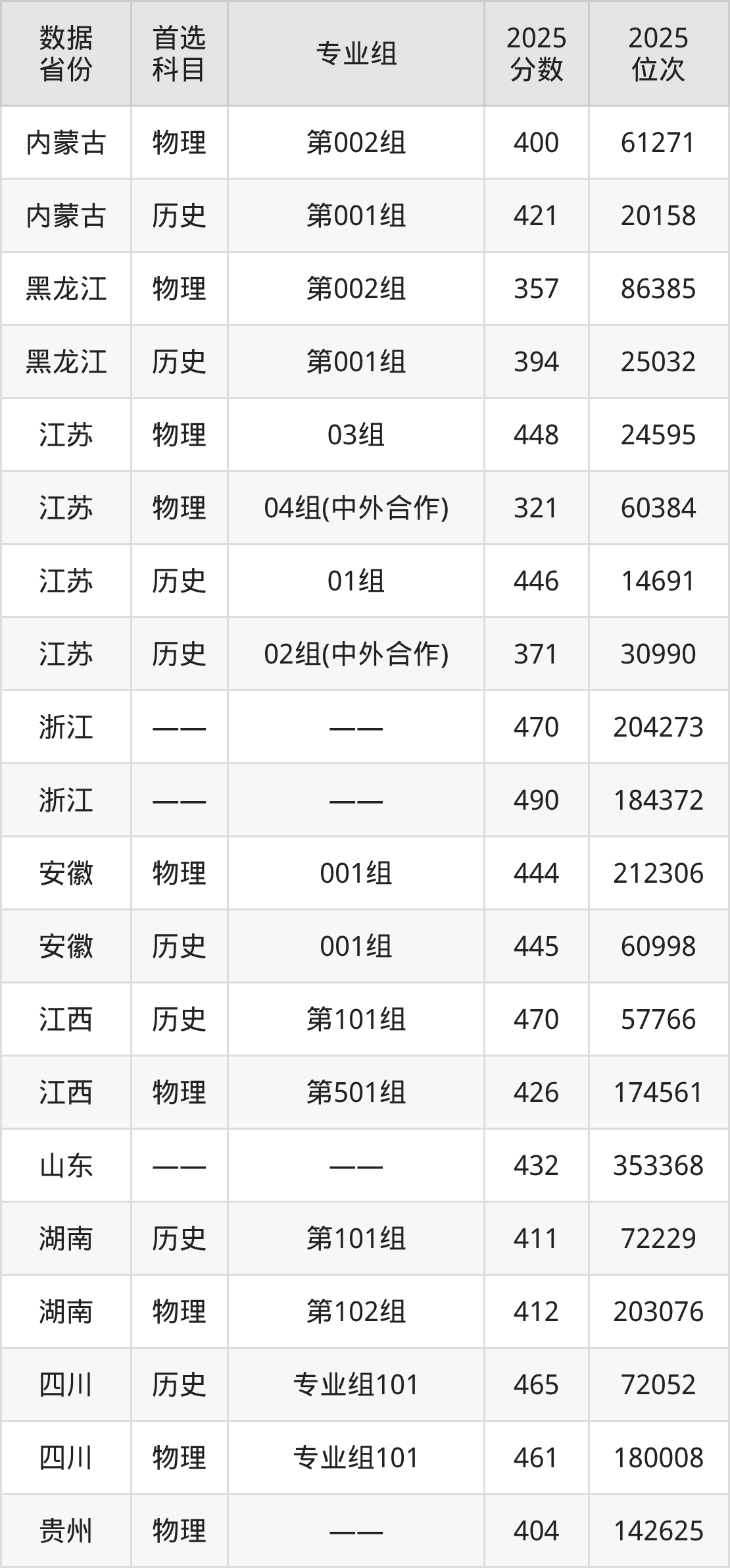 2025年常州机电职业技术学院全国录取分数线最低是321分,最高是490分,平均分在424分左右。在多数地区录取最低分均超过370分。低于370分能上的地区只有黑龙江和江苏,高于平均值较多的是浙江、江西、四川和贵州等地,均有专业组最低分在446分及以上。