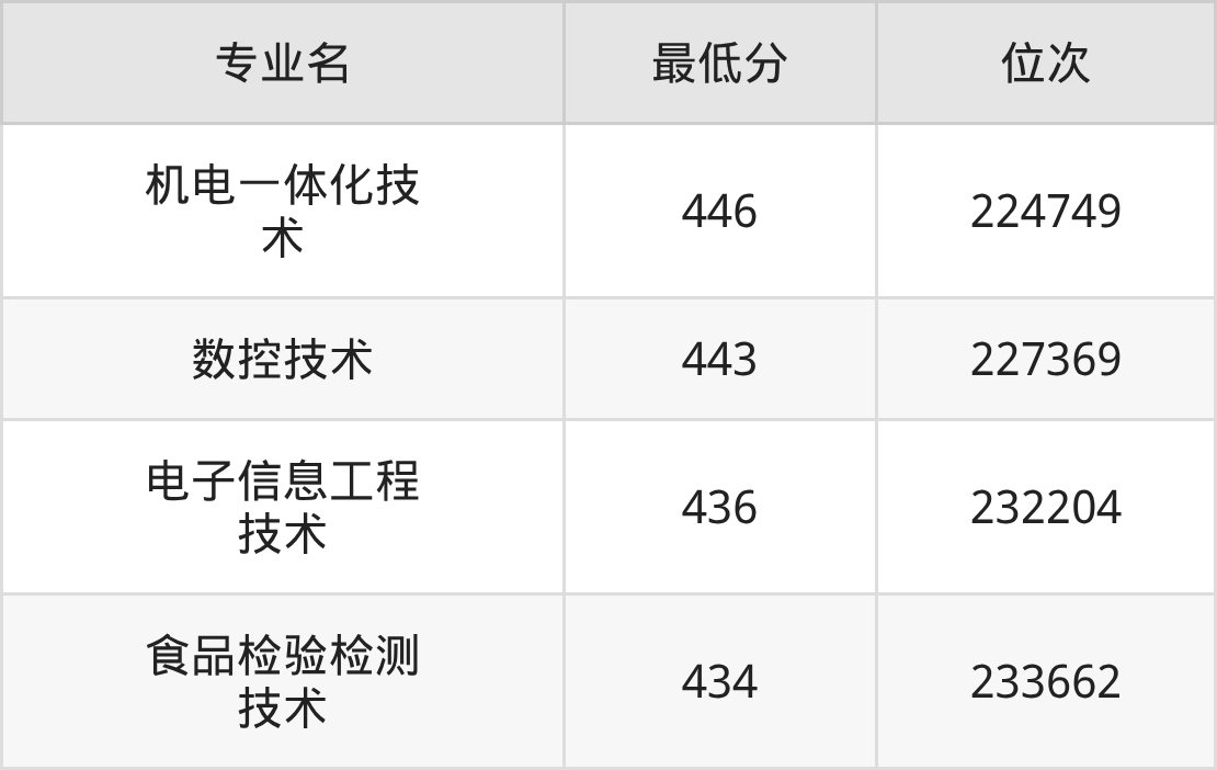 2025年河南职业技术学院招生专业共计4个,其中录取分数线最低的专业是食品检验检测技术,2025年最低分是434分,位次排名是233662名。而该校最难考的专业是机电一体化技术,2025年最低分446分,位次224749名。
