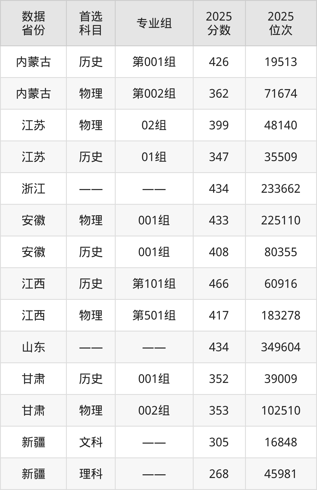2025年河南职业技术学院全国录取分数线最低是268分,最高是466分,平均分在386分左右。在多数地区录取最低分均超过350分。低于350分能上的地区只有江苏和新疆,高于平均值较多的是江西、浙江、山东和安徽等地,均有专业组最低分在433分及以上。
