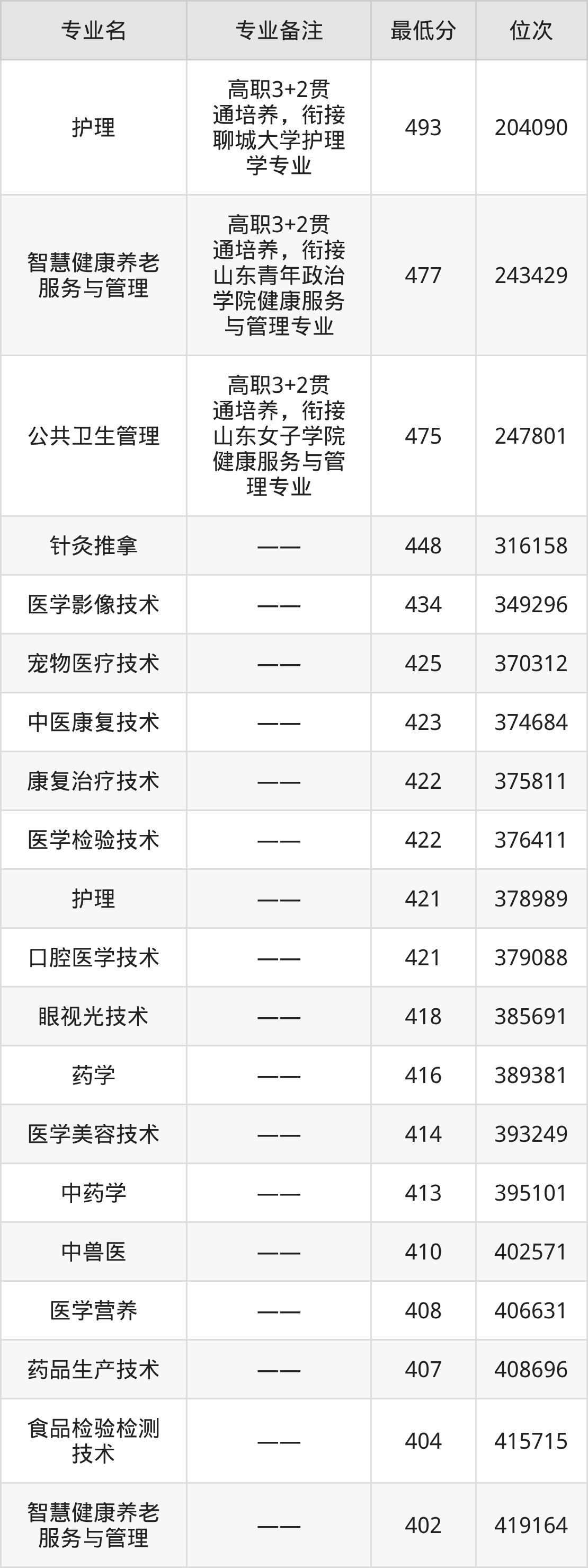 1、护理(高职3+2贯通培养)(衔接聊城大学护理学专业):493分、位次204090名;
