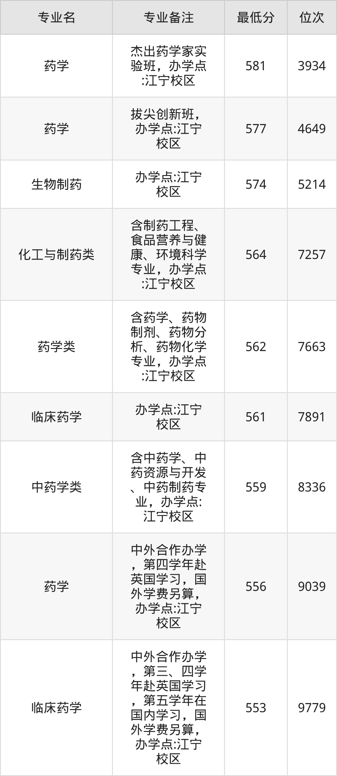 1、药学(杰出药学家实验班,办学点:江宁校区):581分、位次3934名;