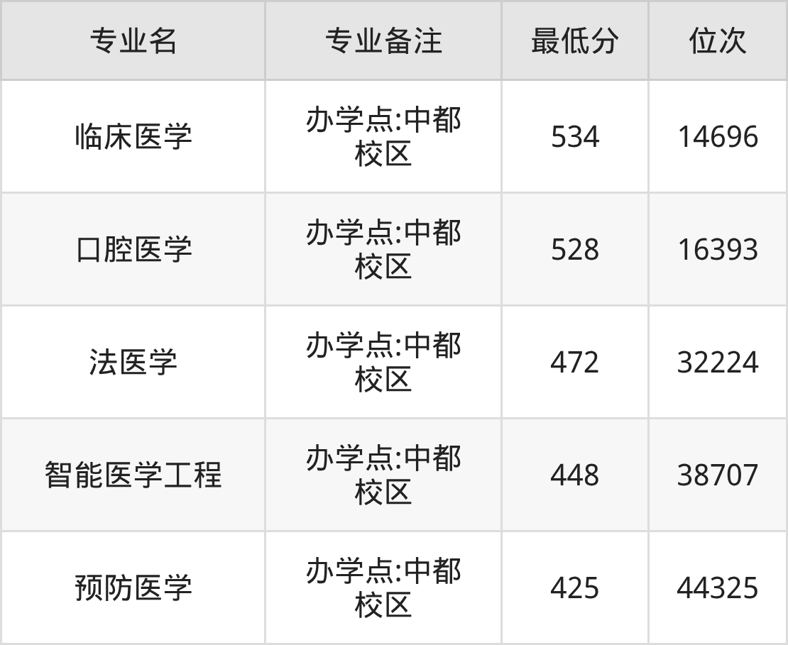 3、法医学(办学点:中都校区):472分、位次32224名;