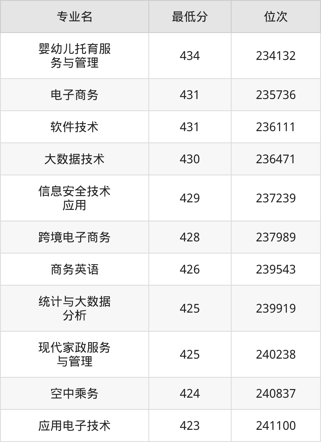 2025年宜春幼儿师范高等专科学校全国录取分数线是150分到423分之间,其中在江西省录取最低分:历史组419分、物理组240分。参考浙江招录数据,各专业分数线是:婴幼儿托育服务与管理434分、电子商务431分、软件技术431分等。