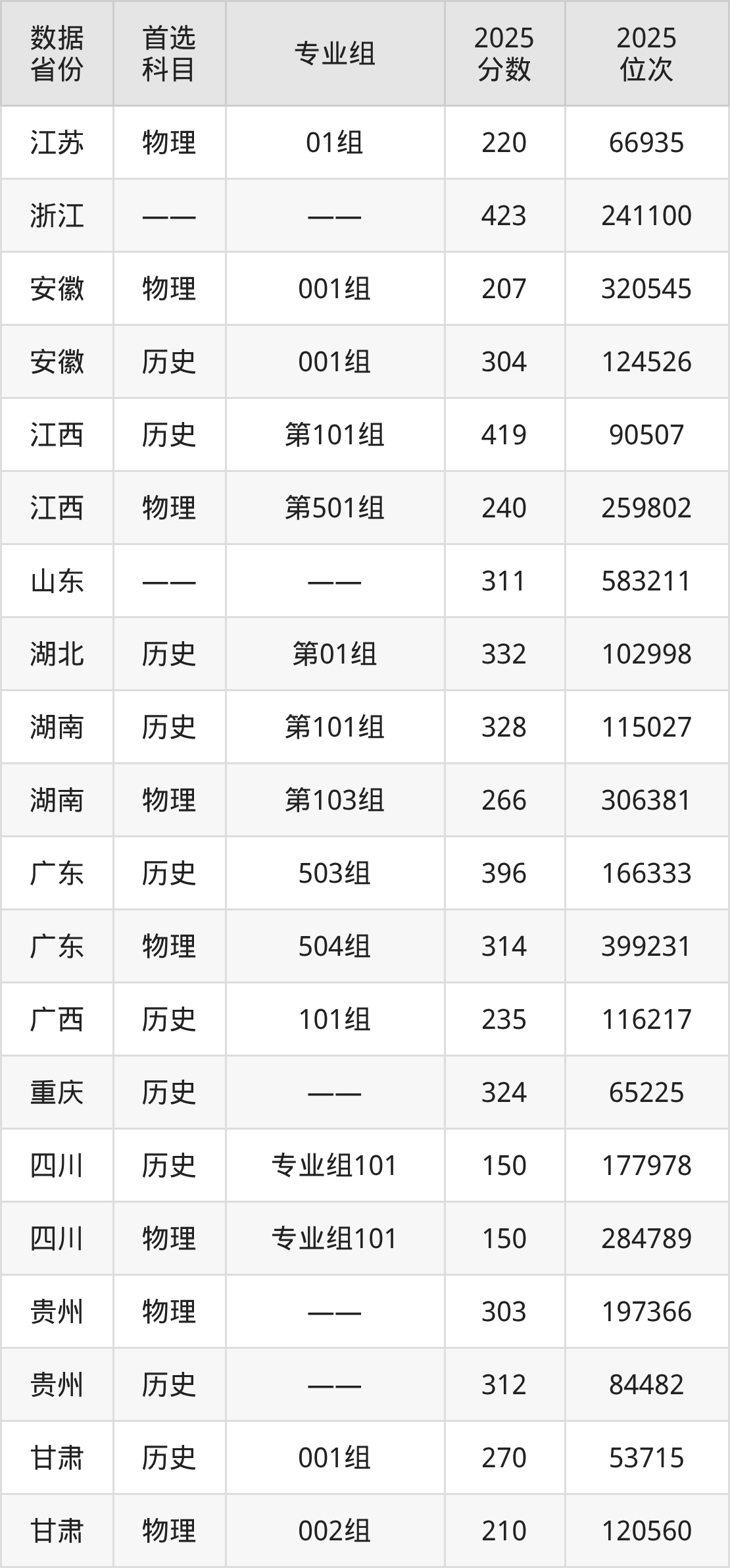 2025年宜春幼儿师范高等专科学校全国录取分数线最低是150分,最高是423分,平均分在284分左右。在多数地区录取最低分均超过210分。低于210分能上的地区只有安徽和四川,高于平均值较多的是浙江、江西、广东和湖北等地,均有专业组最低分在332分及以上。