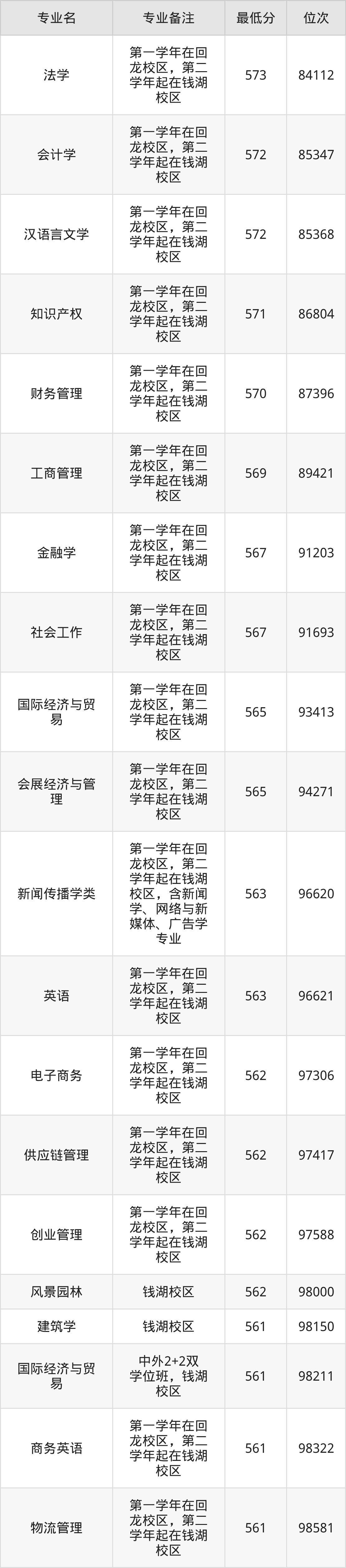 1、法学(第一学年在回龙校区,第二学年起在钱湖校区):573分、位次84112名;