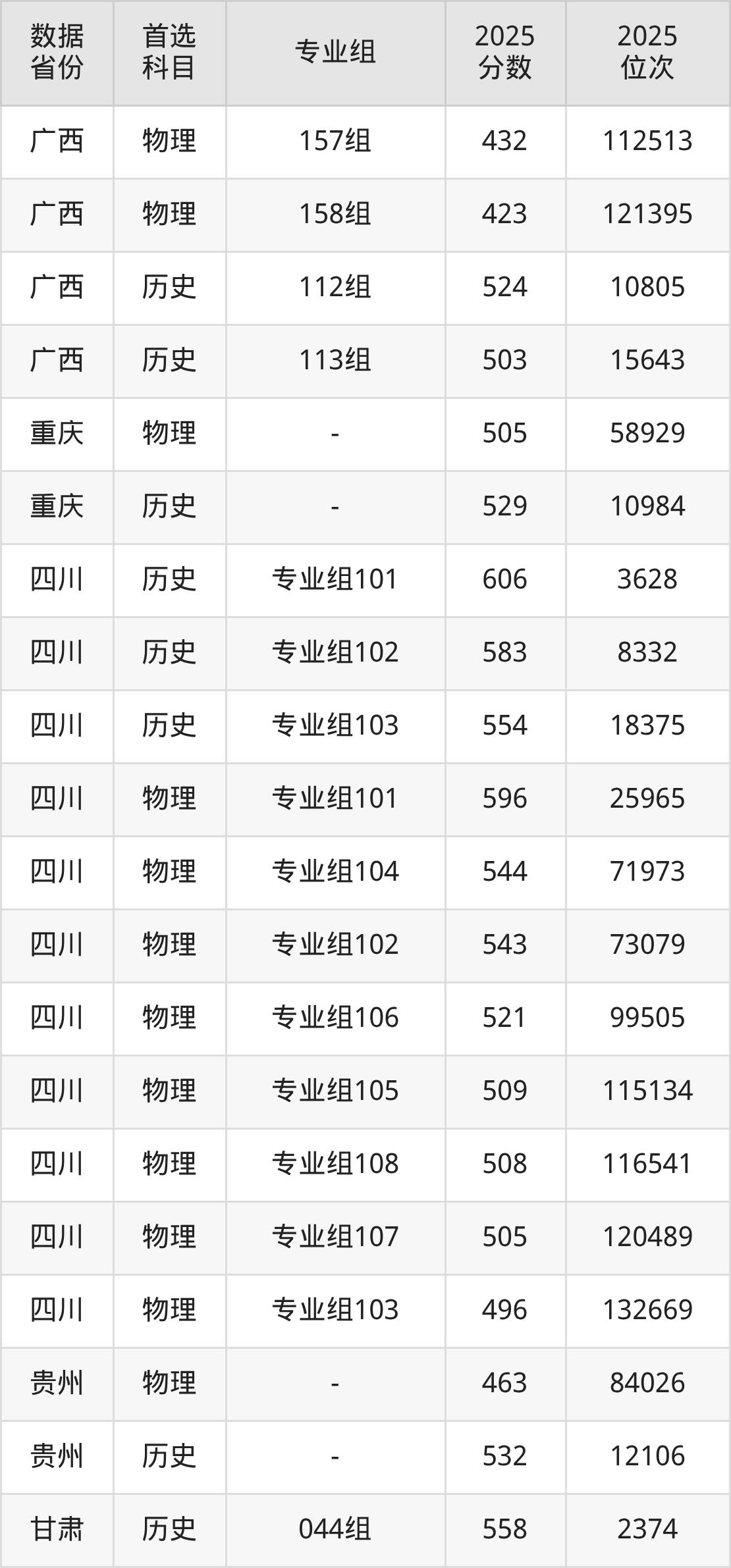 2025年甘肃中医药大学全国录取分数线最低是299分,最高是606分,平均分在481分左右。在多数地区录取最低分均超过380分。低于380分能上的地区只有甘肃,高于平均值较多的是广东、江苏、四川和河北等地,均有专业组最低分在552分及以上。