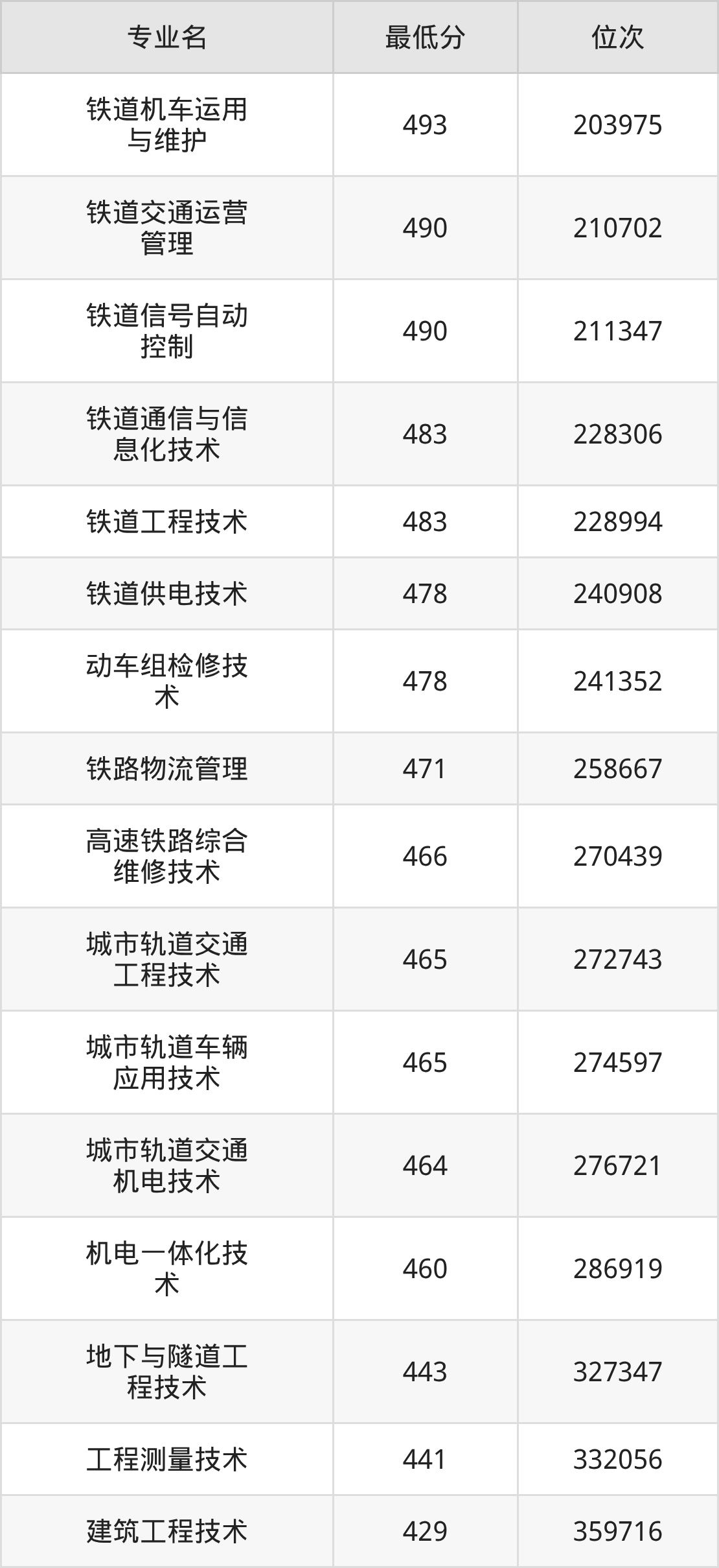 二、石家庄铁路职业技术学院各专业最低分