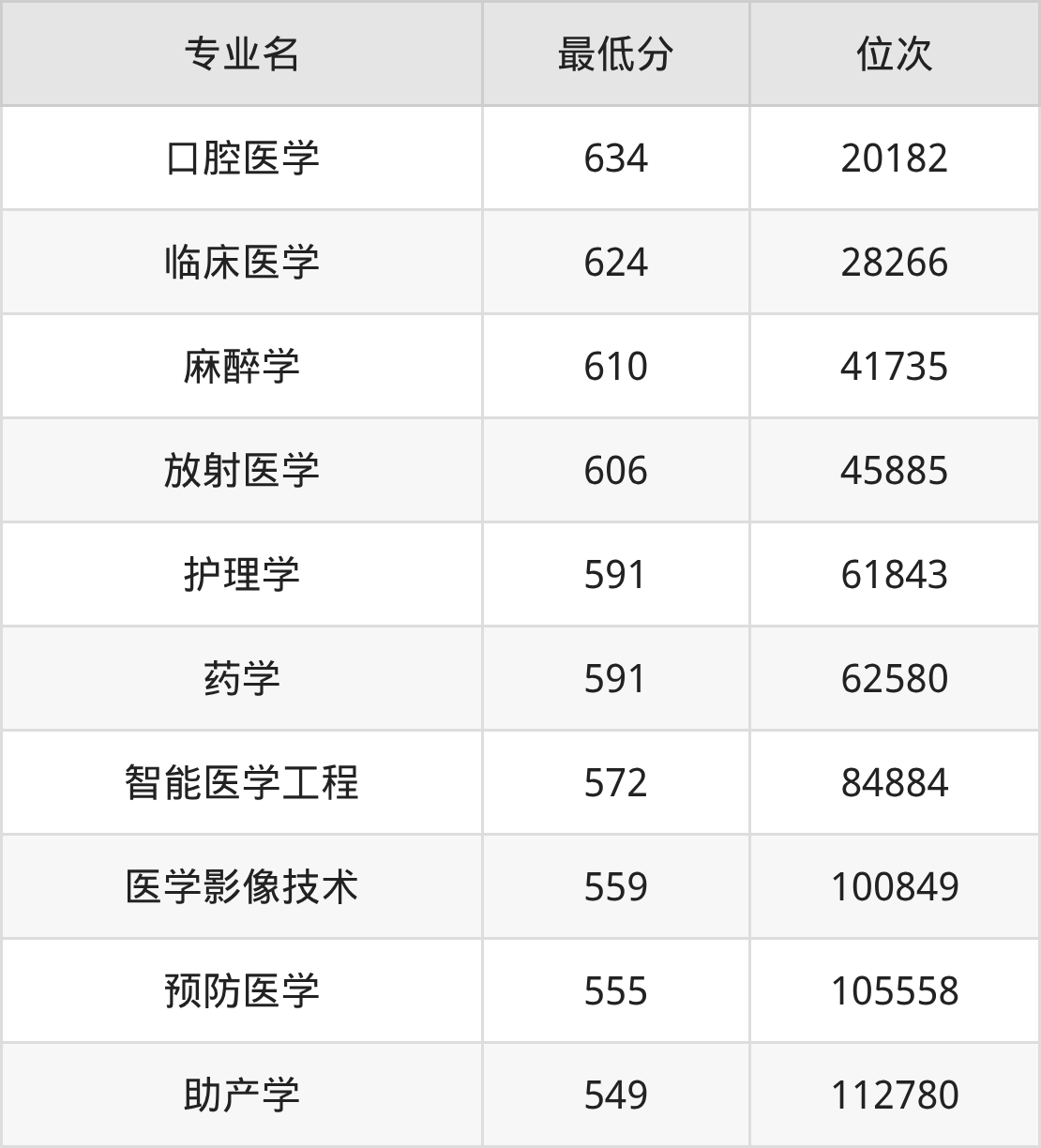 二、福建医科大学各专业最低分