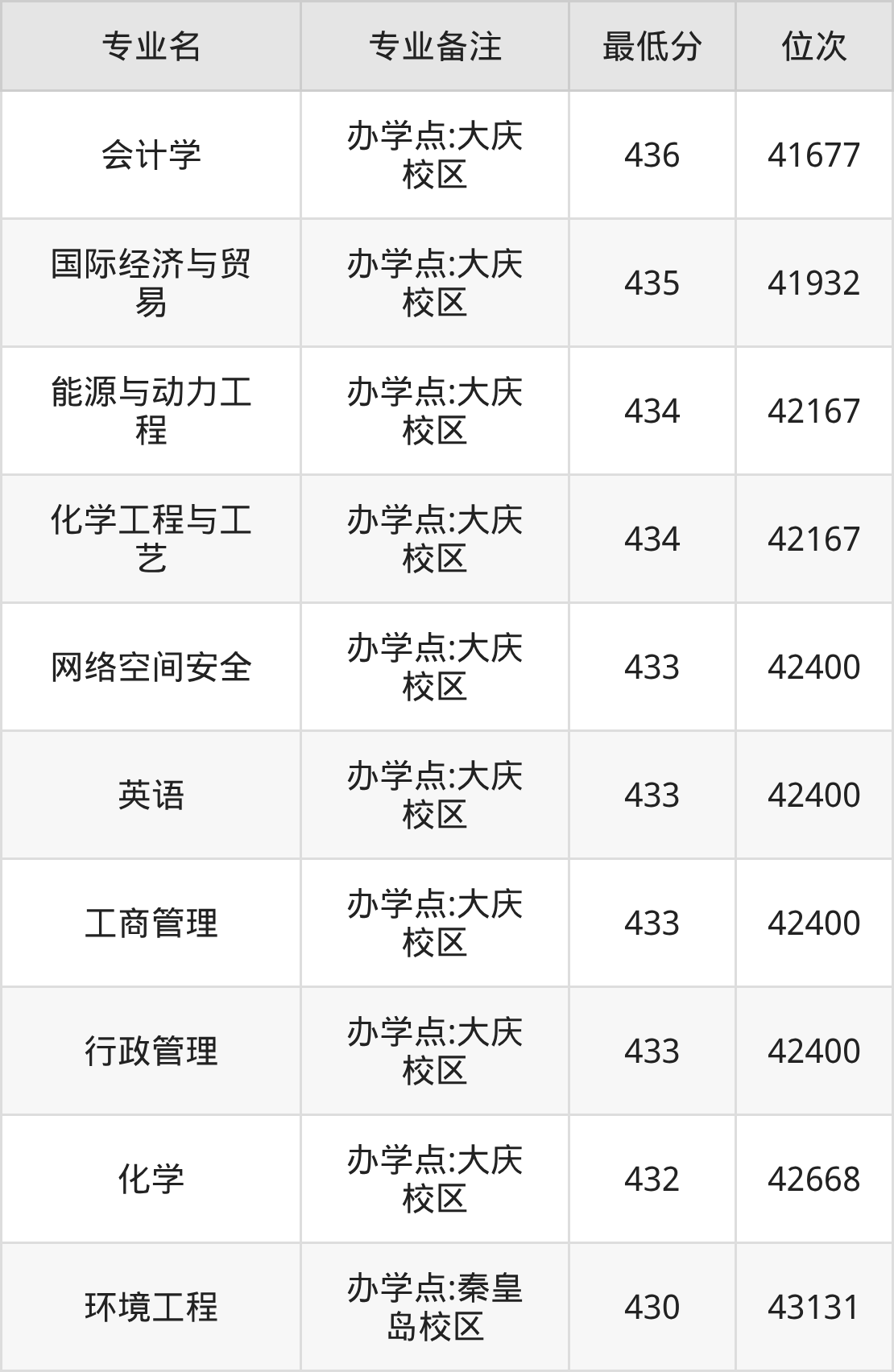 3、能源与动力工程(办学点:大庆校区):434分、位次42167名;