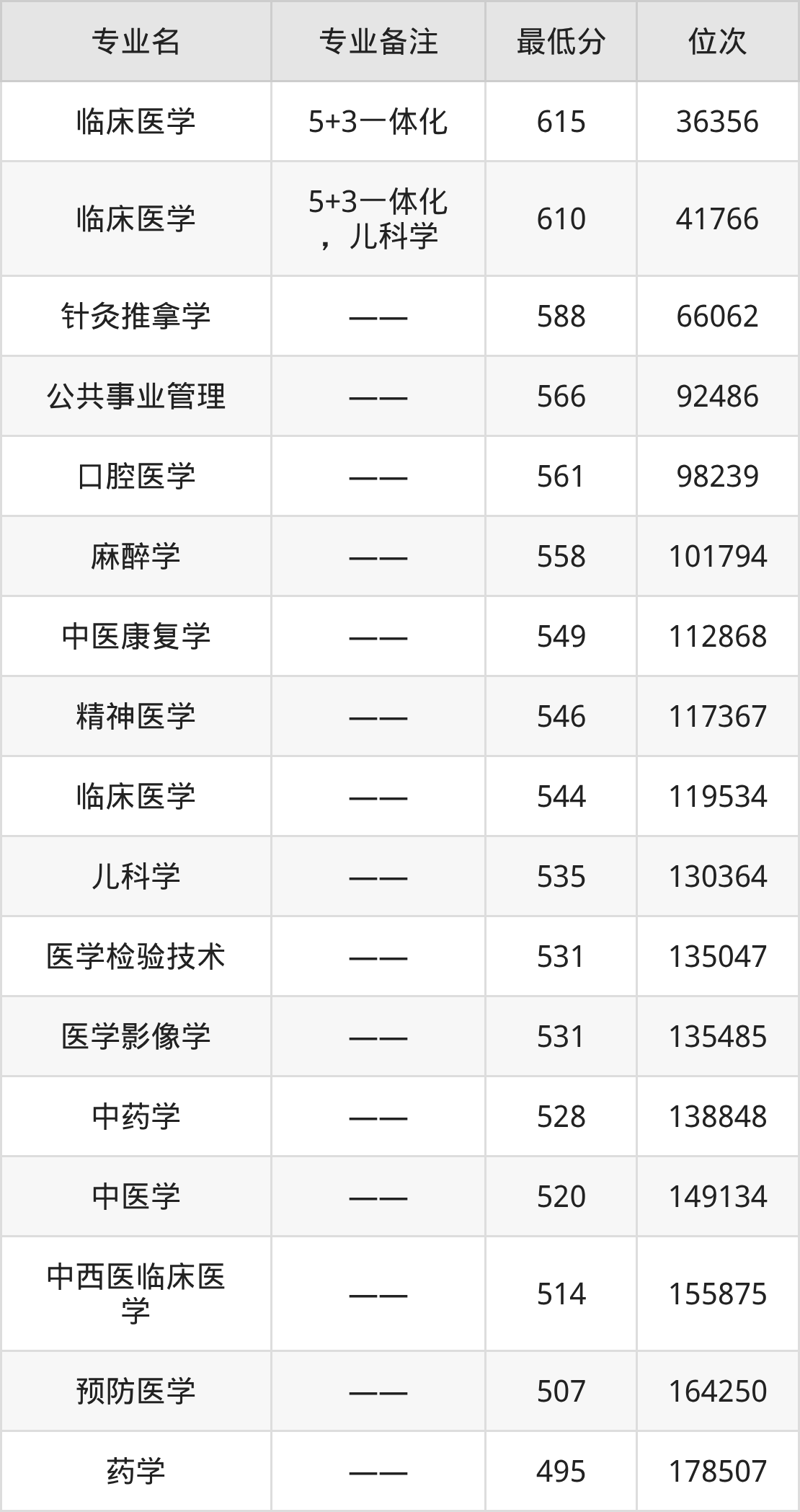 下面是新疆医科大学各省最低分汇总,各专业组录取分数线可参考下方图片: