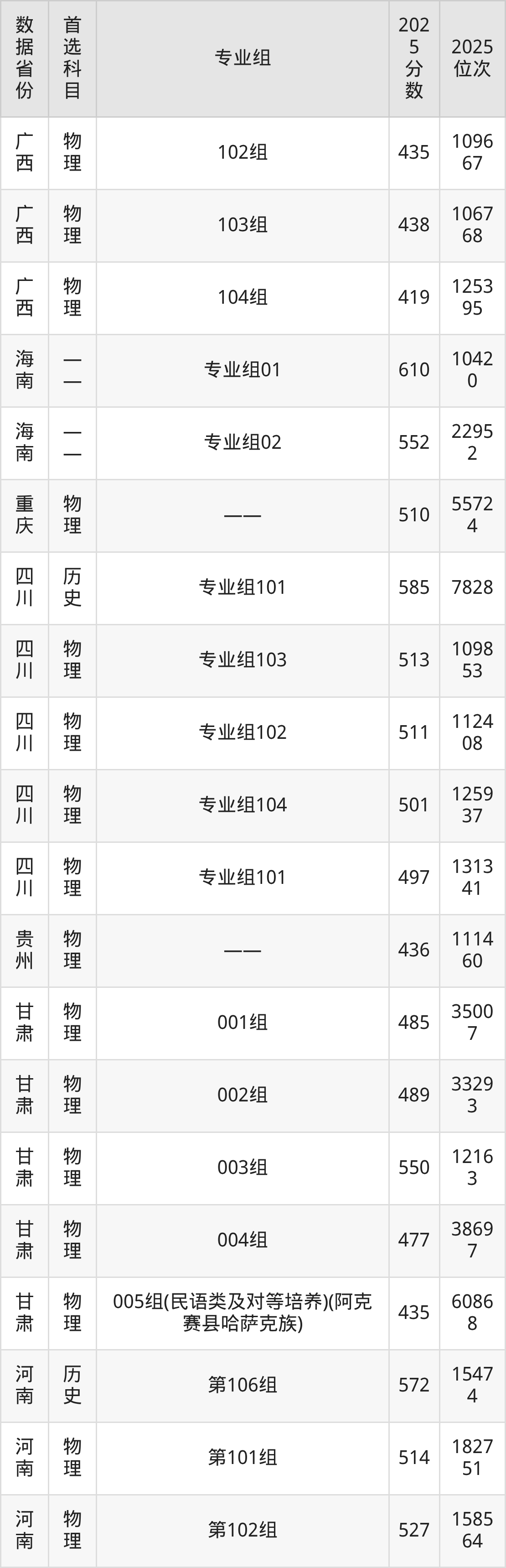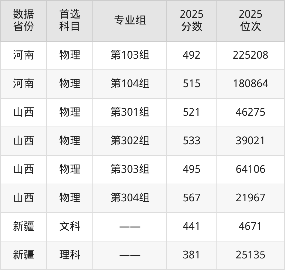 2025年新疆医科大学全国录取分数线最低是364分,最高是610分,平均分在491分左右。在多数地区录取最低分均超过410分。低于410分能上的地区只有广西、新疆和黑龙江,高于平均值较多的是四川、河南、海南和江苏等地,均有专业组最低分在533分及以上。