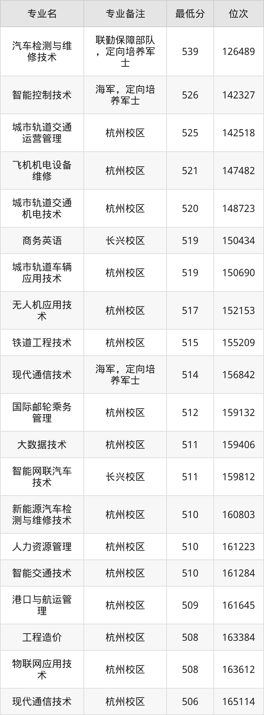 7、城市轨道车辆应用技术(杭州校区):519分、位次150690名;