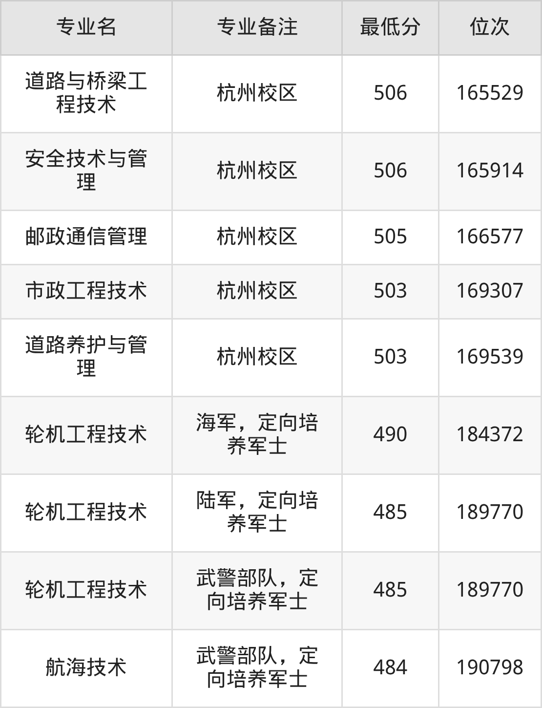 二、浙江交通职业技术学院各专业最低分