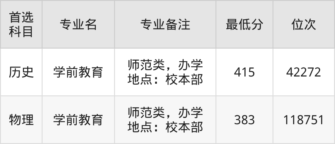 2、学前教育(师范类):383分(物理类)、位次118751名。