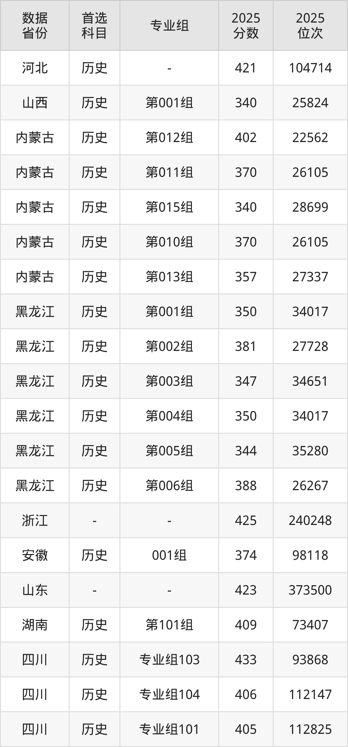 2025年天津艺术职业学院全国录取分数线最低是316分,最高是433分,平均分在376分左右。在多数地区录取最低分均超过340分。低于340分能上的地区只有四川,高于平均值较多的是浙江、山东、河北和湖南等地,均有专业组最低分在409分及以上。