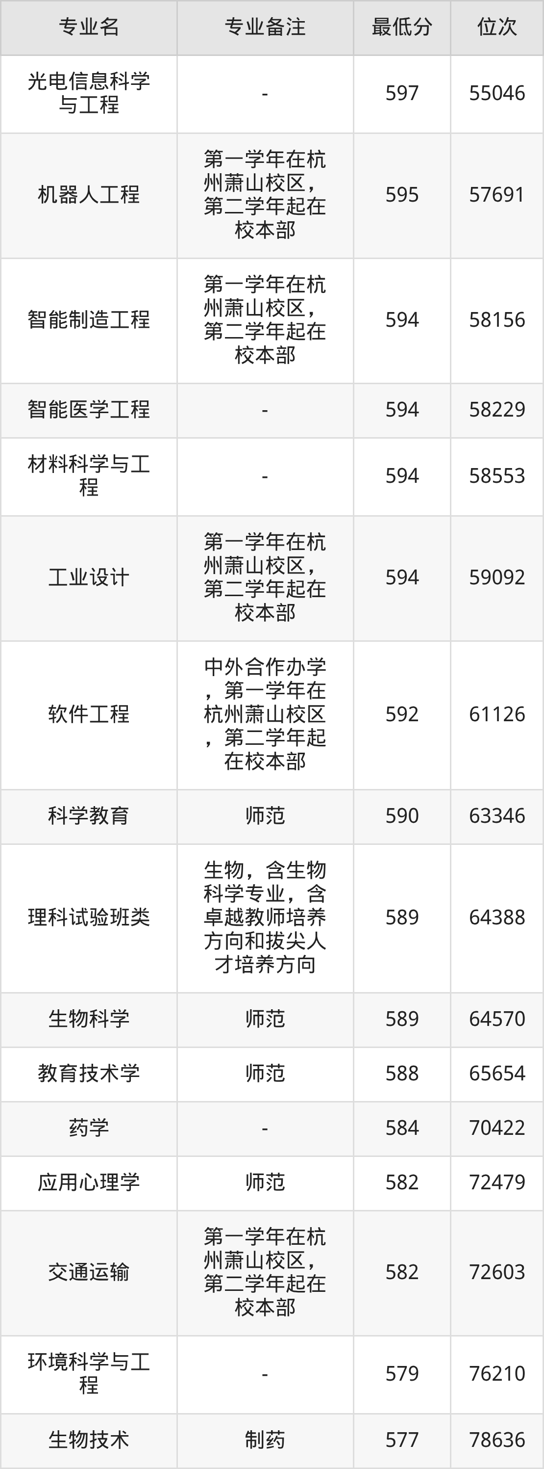 可以发现的是浙江师范大学最低分专业和最高分专业分数差值为71分、位次差值为66618名,不管是分数还是位次,都存在一定差距,因此各位考生在报考时务必参考专业分数线,以免浪费志愿。