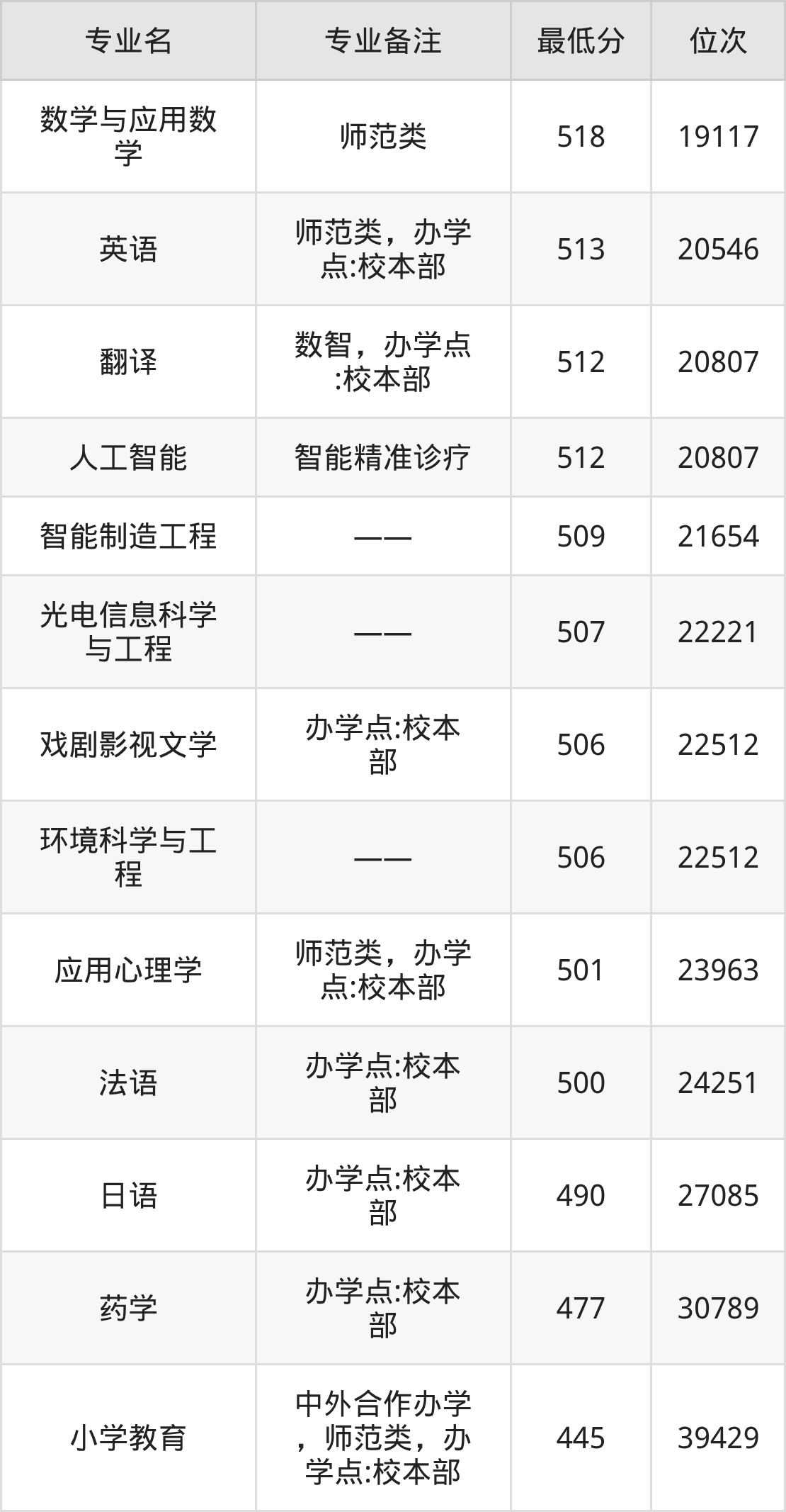 2、英语(师范类,办学点:校本部):513分、位次20546名;