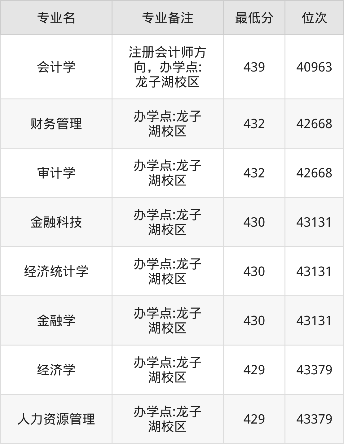 1、会计学(注册会计师方向,办学点:龙子湖校区):439分、位次40963名;