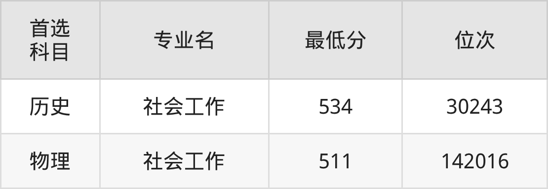 2025年广西警察学院招生专业共计1个,其中录取分数线最低的专业是社会工作(物理类),2025年最低分是511分,位次排名是142016名。而该校最难考的专业是社会工作(历史类),2025年最低分534分,位次30243名。