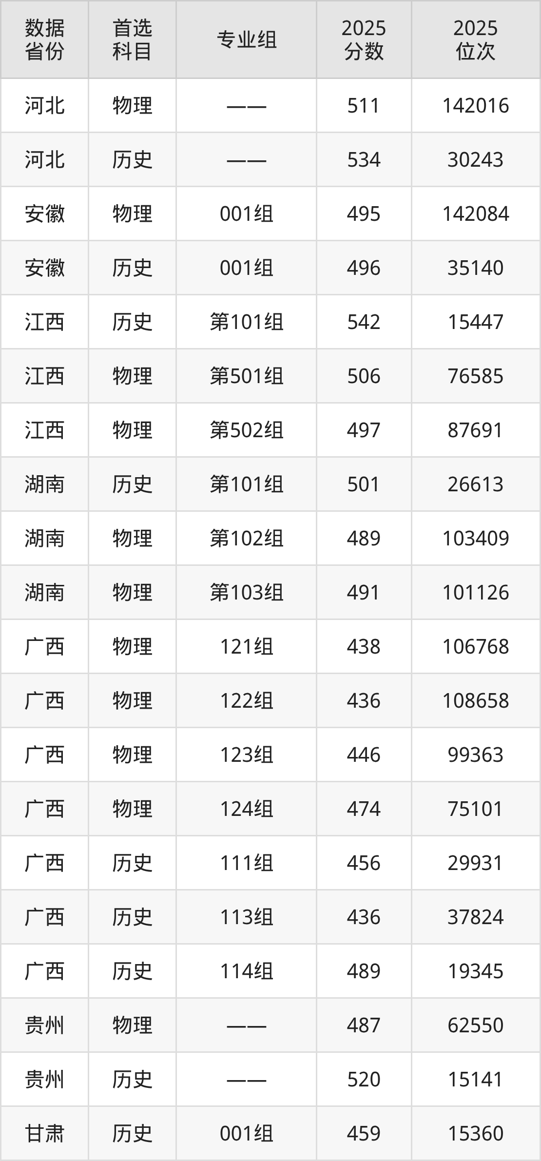 2025年广西警察学院全国录取分数线最低是436分,最高是542分,平均分在486分左右。在多数地区录取最低分均超过460分。低于460分能上的地区只有甘肃和广西,高于平均值较多的是江西、山西、河北和贵州等地,均有专业组最低分在520分及以上。