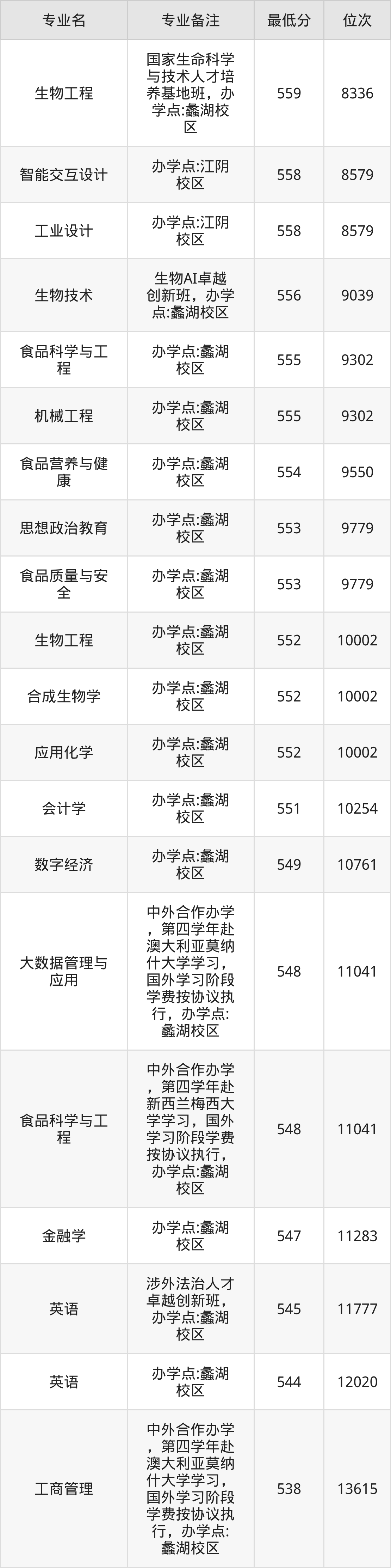 10、生物工程(办学点:蠡湖校区):552分、位次10002名。